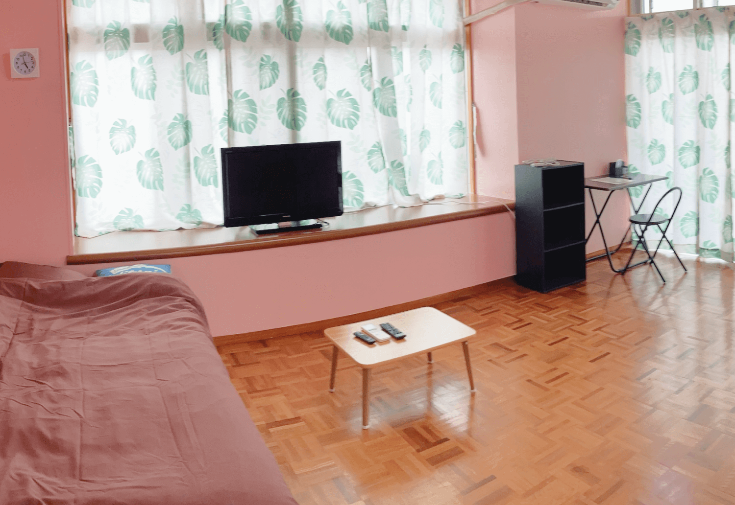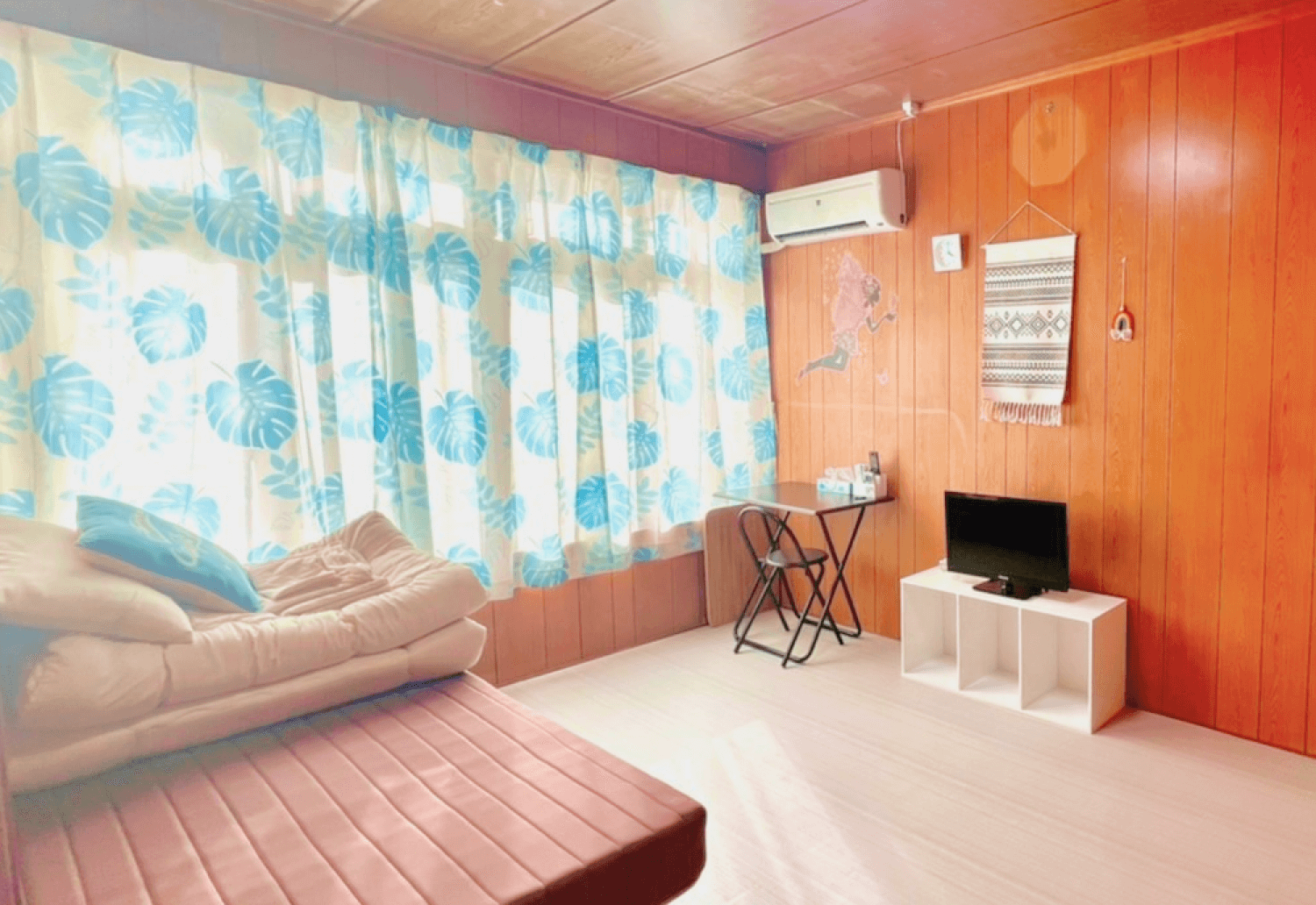エアコン、デスクセット、シーリングライト、ベッド、棚、TV(地上波は映らないです)